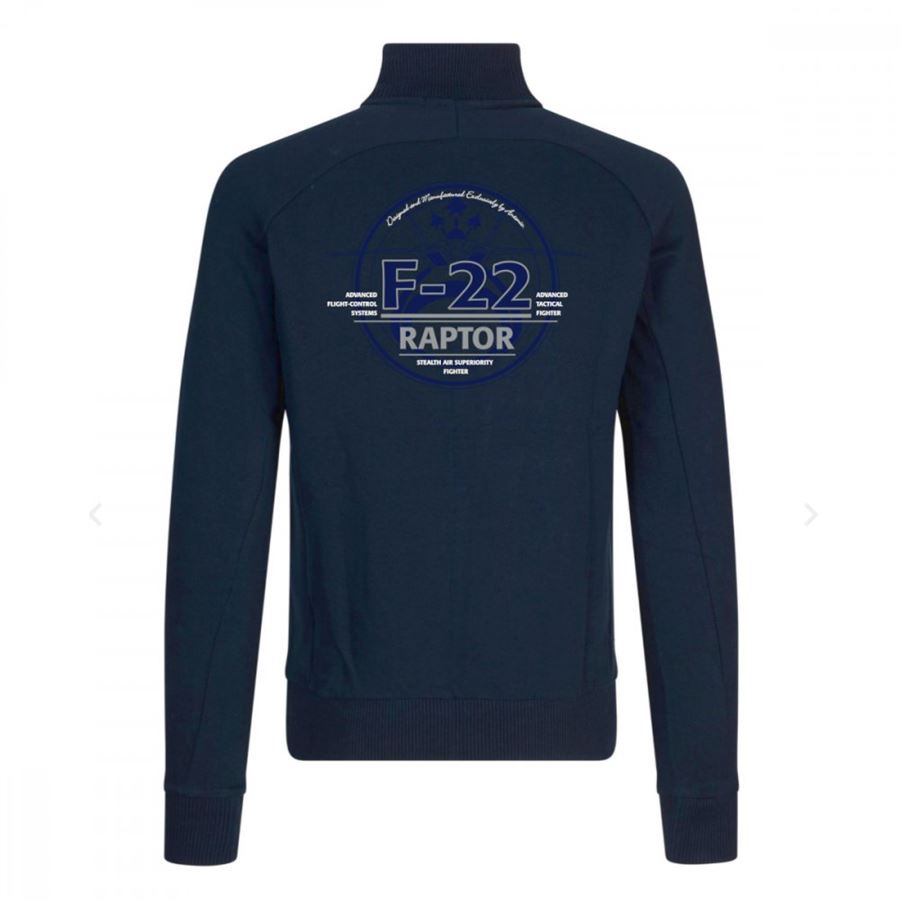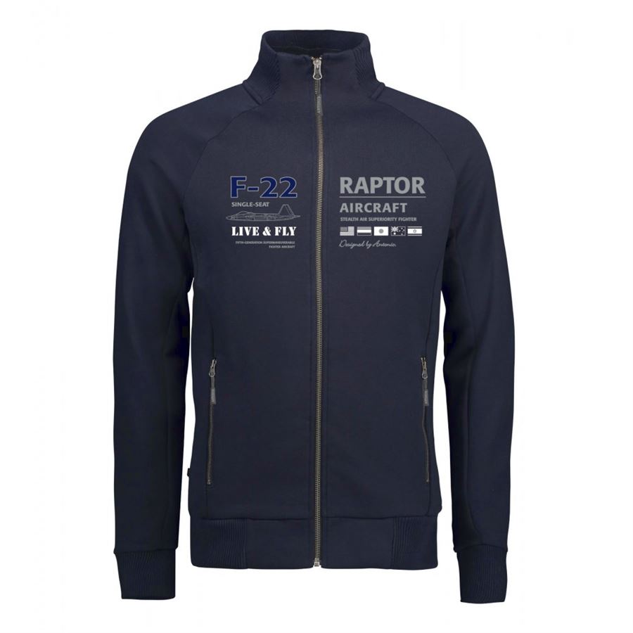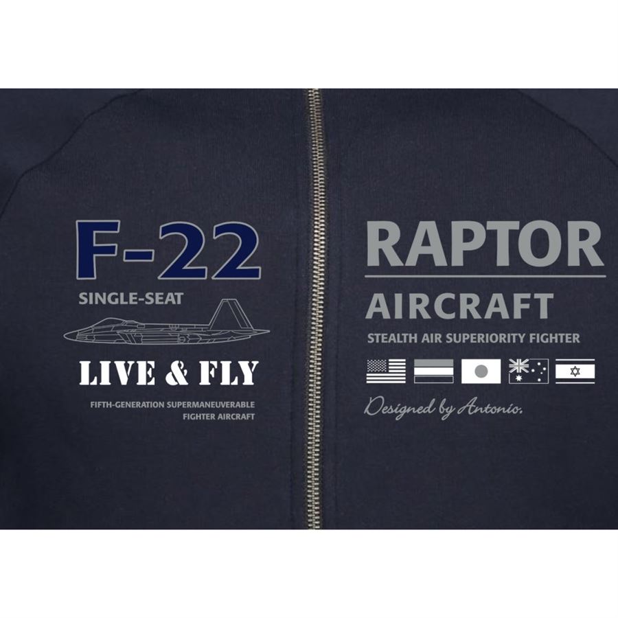 Decent sweatshirt with zip. Two zipped pockets. This is a sweatshirt for aviation lovers. Lockheed Martin Boeing F-22 Raptor. American fighter aircraft using stealth technology. The sweatshirt from Antonio combines blue-grey colors. Design is the hallmark of this admirable flying machine.