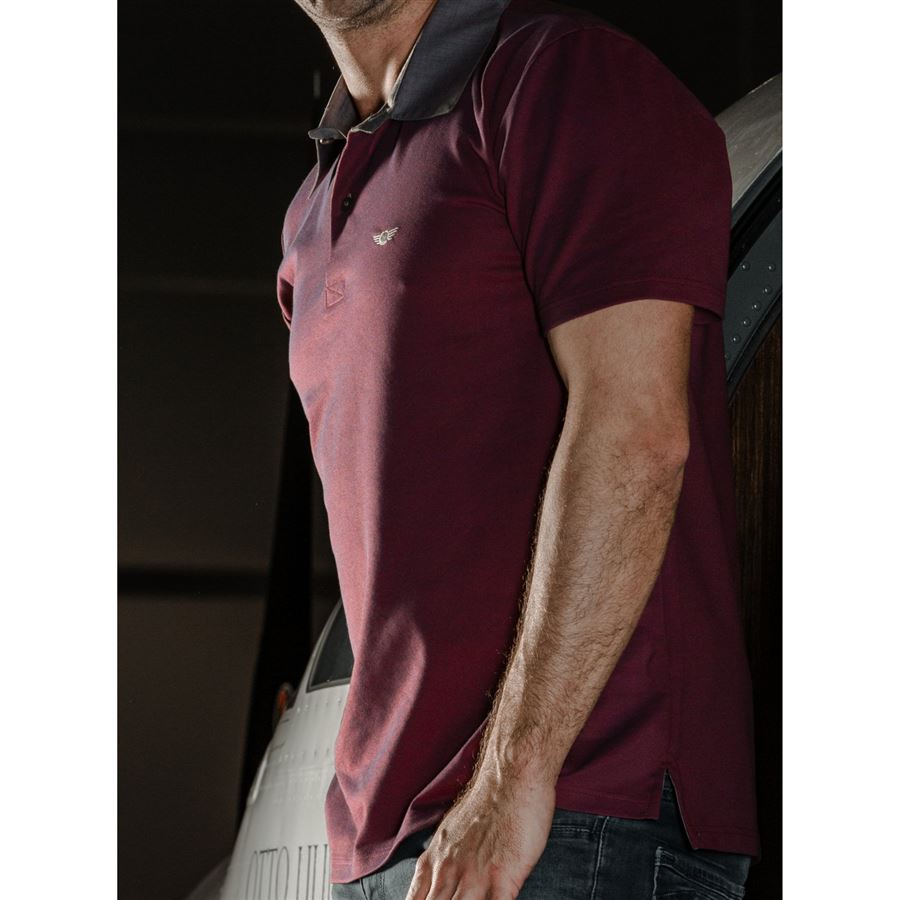 Formal Polo Shirt with short sleeves and embroidered B2F logo. Lightweight and very pleasant dark red DUO PIQUÉ fabric shows a sligh blue reflection under light. In this T-shirt, you can handle a longer trip in a car or an aircraft with a style and convenience.