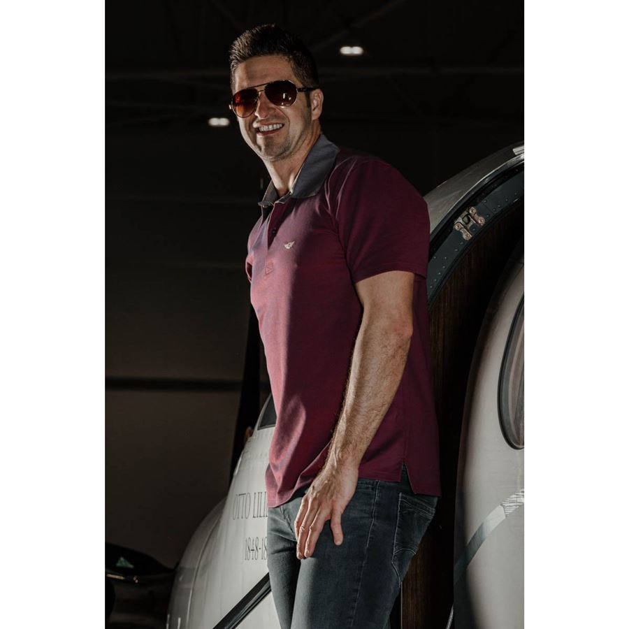 Formal Polo Shirt with short sleeves and embroidered B2F logo. Lightweight and very pleasant dark red DUO PIQUÉ fabric shows a sligh blue reflection under light. In this T-shirt, you can handle a longer trip in a car or an aircraft with a style and convenience.