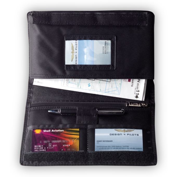 Everything can be perfectly and very securely stowed in this padded nylon document wallet. The interior has two elastic pen holders and three compartments, one of which is zipped. In addition there are two more business card pockets.