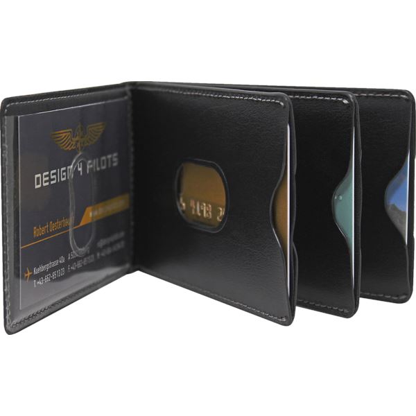 This elegant PILOT CARD HOLDER is made of high quality eco-friendly leather. The card holder is equipped with RFID protection. A stainless steel money clip is on the front side and below a silver metal wing and an embossed PILOT®-Logo on the back. Inside you can find six card-slots for credit cards and one for a business card. The quick access-slots ensure that you find the right card quickly and conveniently. Delivery in a black gift box with silver printing.