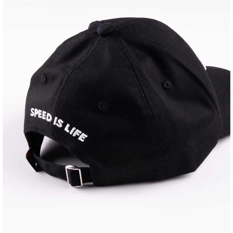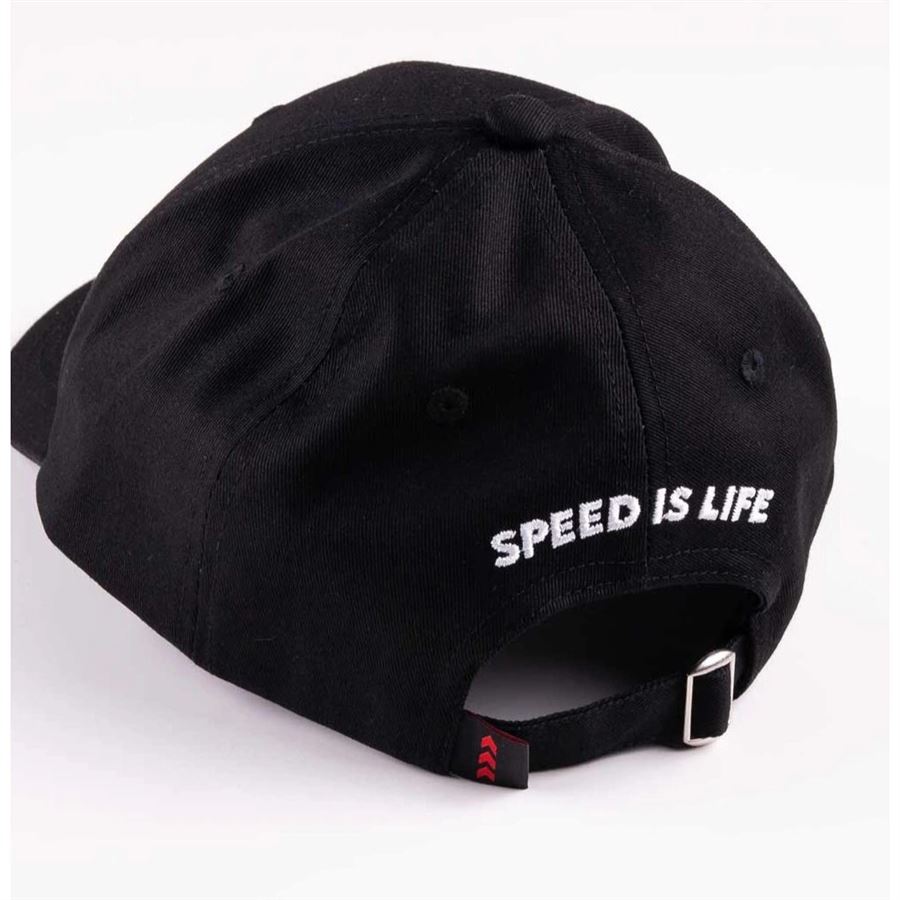 Popular high-end baseball cap "Speed is Life" representing our values : high quality, clean design taste, great function. Adjustable snap back to fit great.