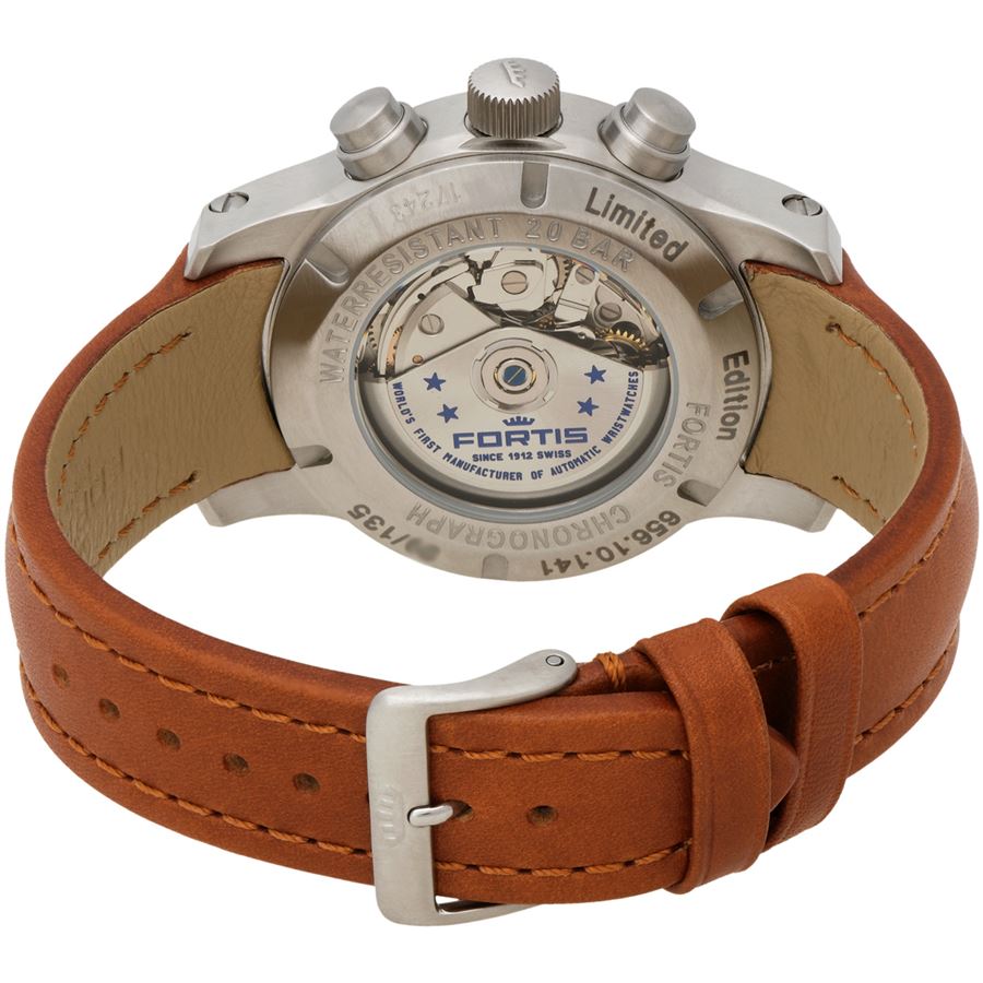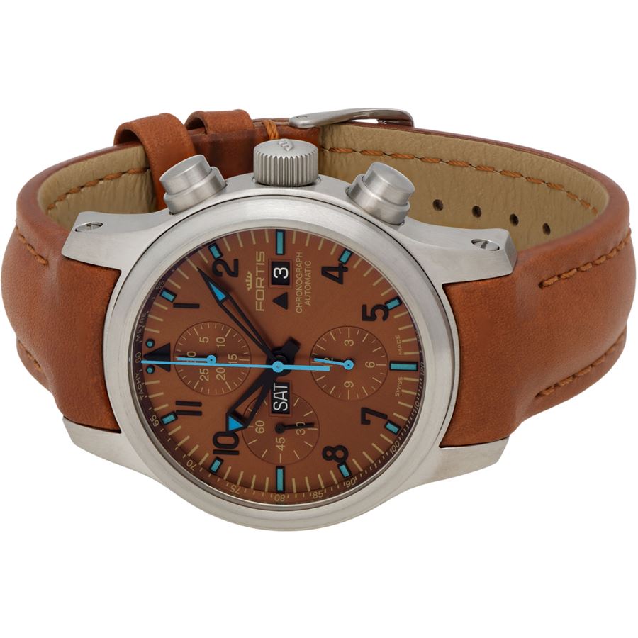 The 42mm brushed steel case protects the Swiss automatic ETA Valjoux 7750 movement with 25 jewels, 28,800 vibrations per hour and a power reserve of 40 hours. The movement is visible through the display back. The blue contrast elements on the brown sunday dial add a distinctive touch to this professional instrument. The dial is completed by the typical Fortis aviation hands and raised Arabic numerals and indices. Hands, indices and the two dots at 12 o'clock are coated with blue Super-LumiNova, green afterglow. Information The Fortis Blue Horizon Chronograph is water resistant to 200 metres and is matched to a cognac brown leather strap.