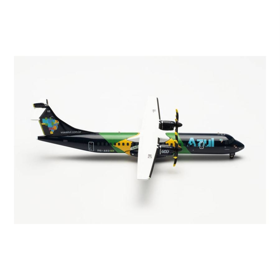 Metal model of airliner ATR 72-600 (72-212A) designed in Azul Linhas Aéreas Brasileiras "Brazilian Flag" colors, named "Brasileirinho" and with reg. PR-AKO.