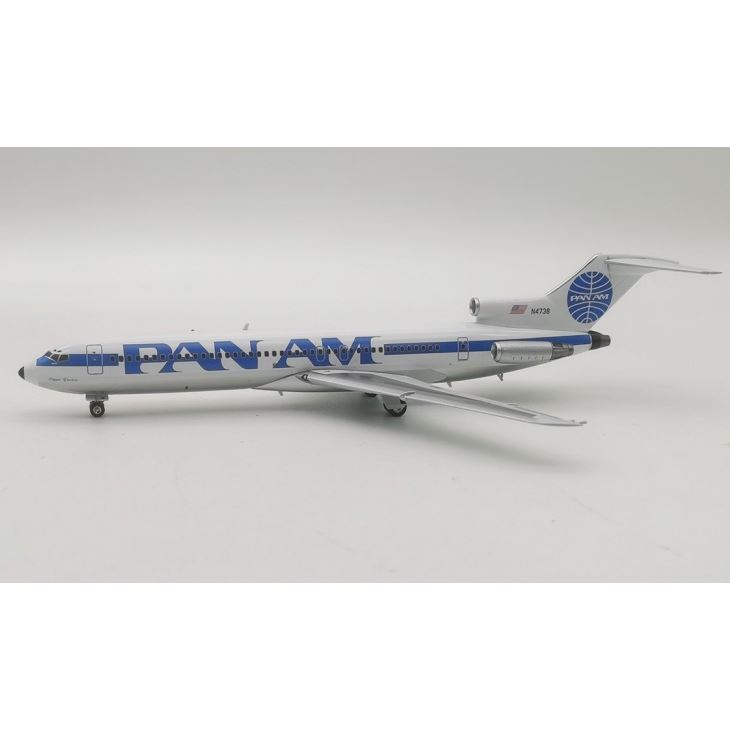 Metal model of aircraft Boeing B727-235 designed in Pan American World Airways "1980s - Billboard with cheatline test livery" colors and named "Clipper Electric". Model with reg. N4738. Stand included.