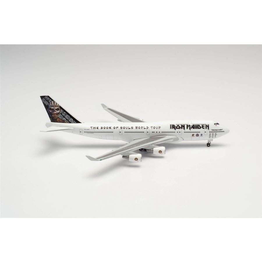 Metal model of airliner Boeing B747-428 with stylish livery of Iron Maiden - The Book Of Souls World Tour, Named "Ed Force One", with reg. TF-AAK.