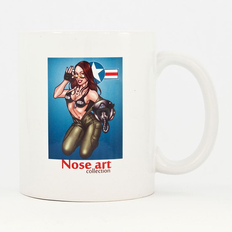 White ceramic mug of the collection Nose Art II. WW with Pin-Up model. Dye sublimation, suitable used in a dishwasher. Advantages of the dye sublimation: strong permanence and endurance of the printing.