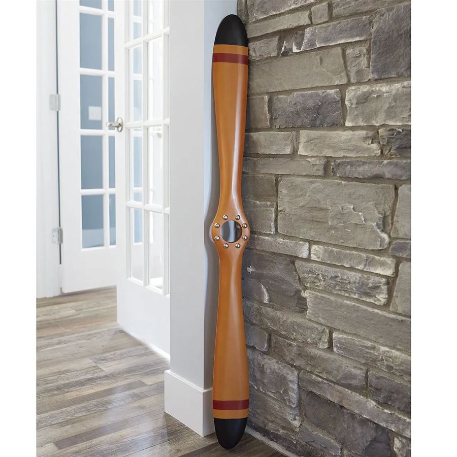 This Vintage Propeller is hand-crafted of wood and features hand-painted black tips accompanied by a red stripe, replicating wooden propellers from the early days of aviation. Center hub has chrome plated tacks to simulate bolts, and a keyhole hanger mounted on the back for easy hanging.Measures:ca 117 cm x 11 cm x 3 cm