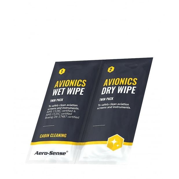 Dvoudílný sáček Aero - Sense obsahuje jeden mokrý a jeden suchý ubrousek, které jsou vhodné pro čištění všech leteckých obrazovek a přístrojů s antireflexní vrstvou. Tento nový produkt je bez alkohol a amoniaku a nezanechává na ošetřovaných plochách, tolik nežádoucí, šmouhy po čištění.