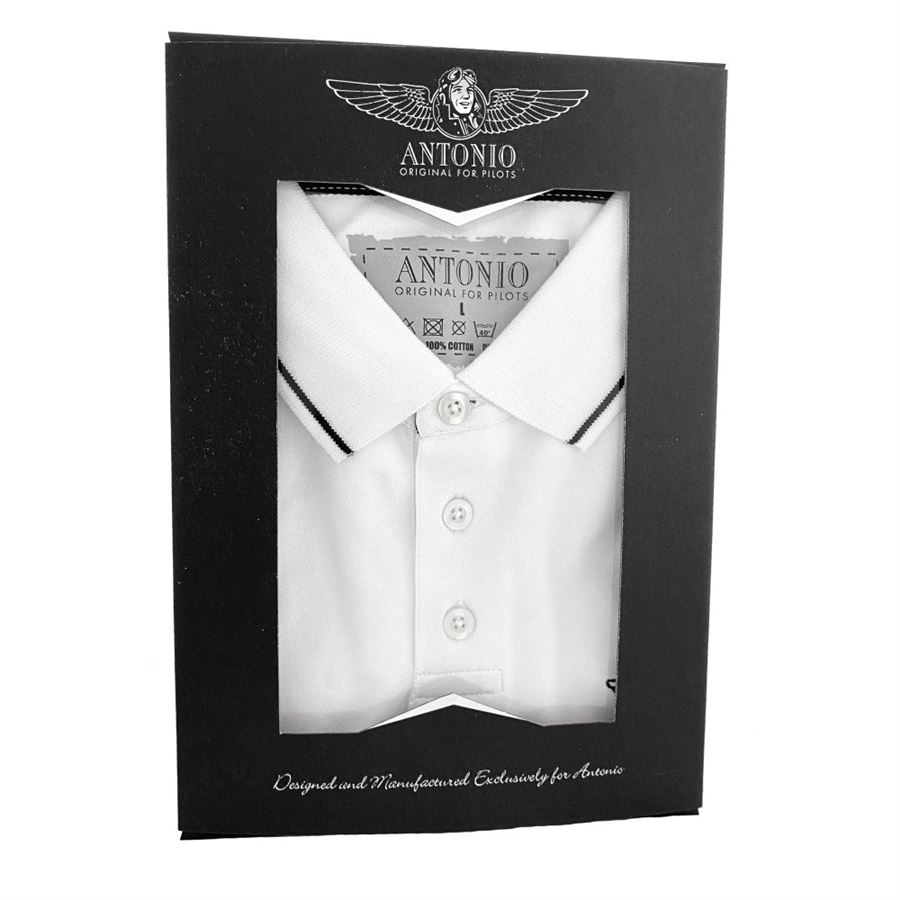 Bílé polo tričko s jednoduchým vyšívaným logem ANTONIO WINGS. Staňte se členem rodiny ANTONIO. Pro opravdové milovníky létání.