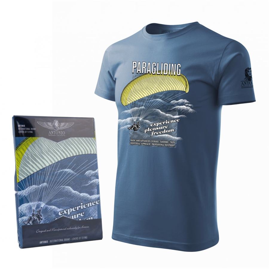 Letecké tričko s motivem plachtění vzduchem. Muž s padákem v přední části trička je symbolem závislosti na tomto sportu tělem i duší.