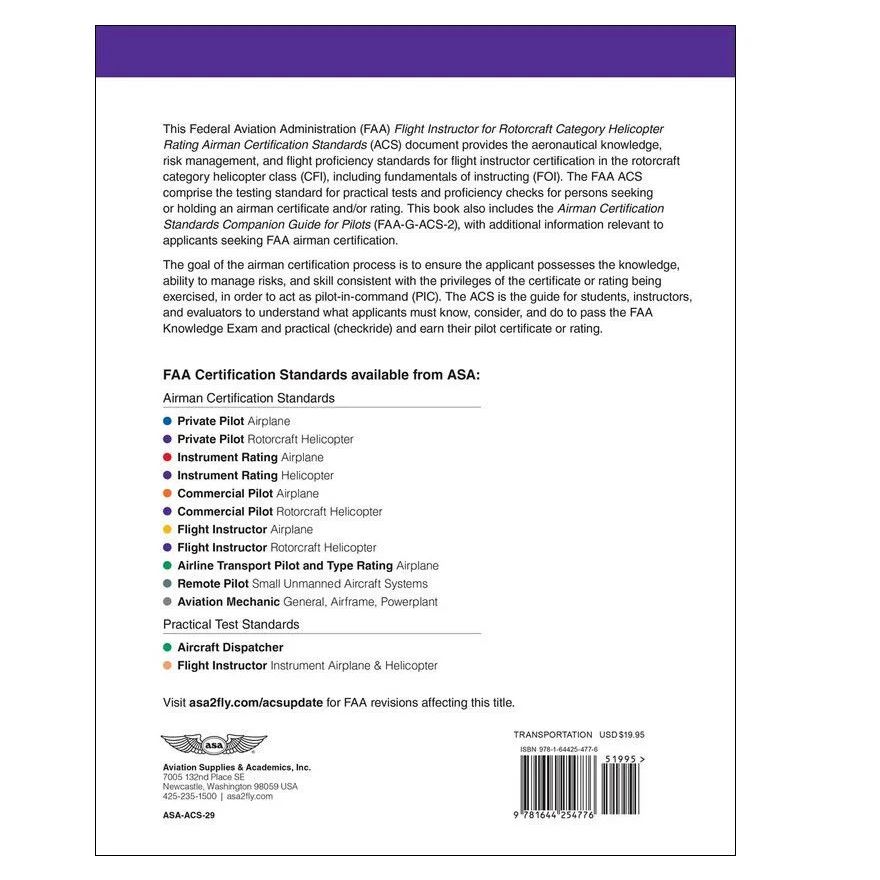 Tato kniha Federálního úřadu pro letectví (FAA) Flight Instructor Helicopter Airman Certification Standards v měkké vazbě (ACS-29) nahrazuje Standardy praktických zkoušek (8081-16B) a je průvodcem pro studenty a instruktory, pro absolvování zkoušky FAA a získaní kvalifikace leteckého instruktora vrtulníku v kategorii rotorových letadel, třída vrtulníků. Tento ACS zahrnuje letecké znalosti, řízení rizik a standardy letové způsobilosti nezbytné pro certifikaci, kódy ACS a průvodce (FAA-G-ACS-2). Zahrnuje testy Fundamentals of Instructing (FOI) a Flight Instructor Helicopter (CFI).