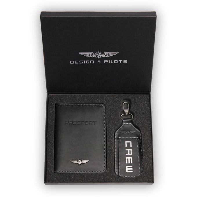 Tento elegantní set je vyroben z vysoce kvalitní ekologické kůže. Skládá se z cestovního obalu na pas se stříbrným kovovým křídlem na vnější straně. Uvnitř naleznete tři kapsy na kreditní karty, jedna na vizitky a kapsa na SIM kartu. Druhá část setu je štítek na zavazadla s potiskem "CREW" na obou stranách, s krytkou štítku a pevnou sponou.