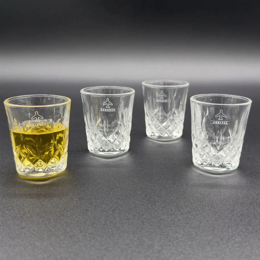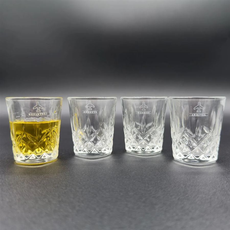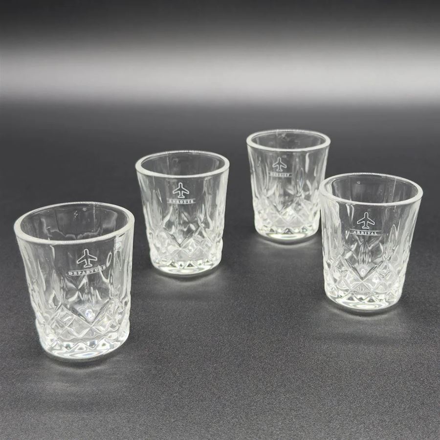Velmi originální a vtipná sada čtyř panákových skleniček - každá pojmenovaná s leteckou tématikou - odlet, cesta, přílet, hlášení.