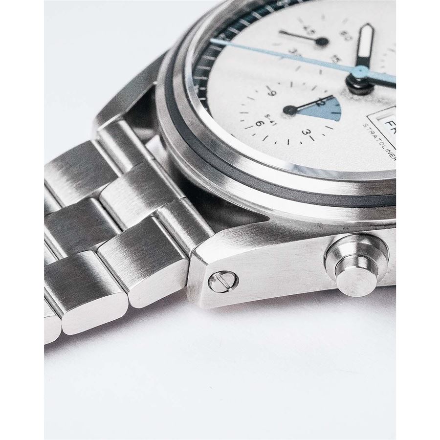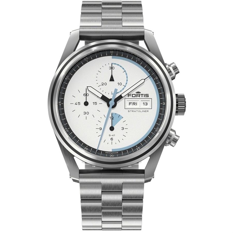 Pánské luxusní hodinky Stratoliner S-41 White Dust je model švýcarských hodinek od renomované společnosti FORTIS určený nejen pro piloty. Hodinky Stratoliner S-41 White Dust mají pouzdro i náramek z pevné ušlechtilé oceli. V pouzdře spolehlivě pracuje švýcarský mechanický strojek Fortis UW-17 s automatickým nátahem. Tento vlastní strojek Fortisu byl ve spolupráci se švédskou vesmírnou agenturou poslán do vesmíru a testovaný ve stratosféře. Hodinky Stratoliner S-41 však využijete nejen při cestě do kosmu, ale i při každodenním nošení. Bílý číselník je chráněn vysoce odolným antireflexním safírovým sklíčkem, které zajišťuje skvělou čitelnost i na přímém slunci. Za tmy a při zhoršených světelných podmínek umožňuje skvělou čitelnost podsvícení na ručičkách a indexech.