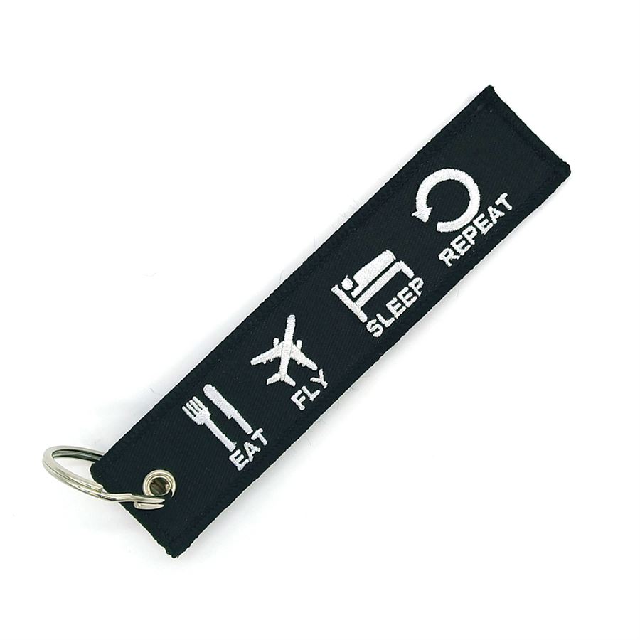 Stylové klíčenky s vyšívaným vtipným nápisem "EAT FLY SLEEP REPEAT" na obou stranách. Nové a velmi populární klíčenky. Dodává se se split kroužkem.Velikost:130 mm dlouhá Barva:černá
