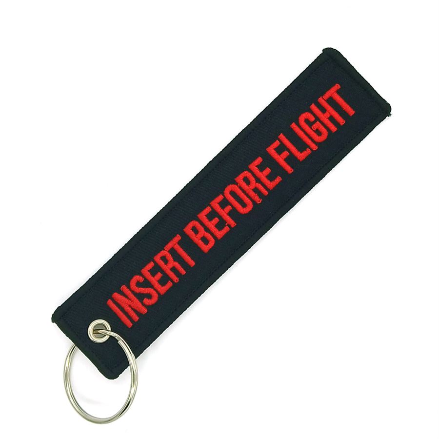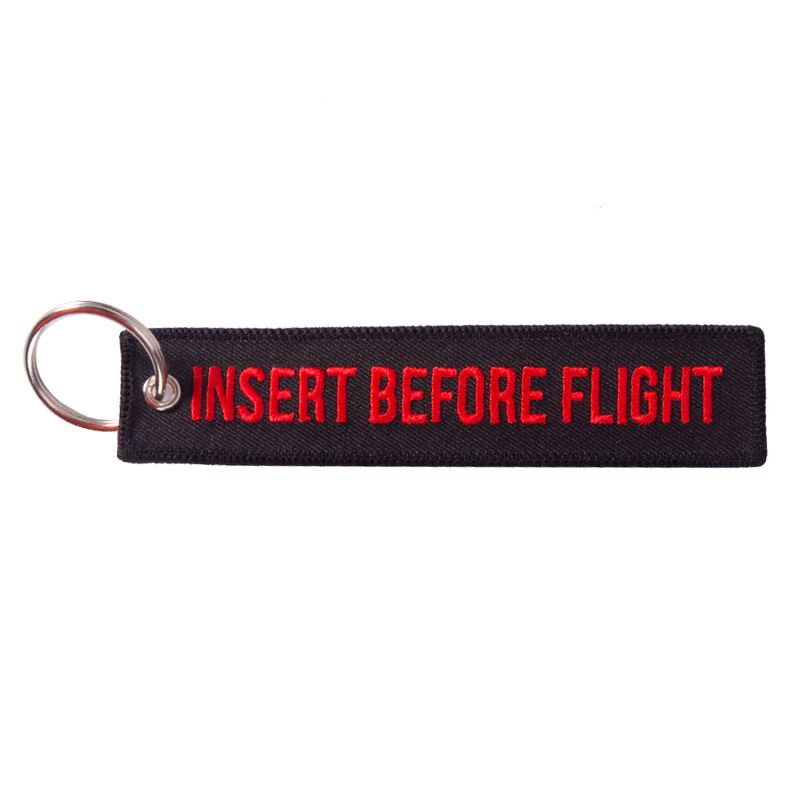 Oblíbené klíčenky jako stylový doplněk nebo vhodné jako dárek pro letecké nadšence. Kvalitně vyšitý nápis 'INSERT BEFORE FLIGHT' na obou stranách. Nové a velmi populární klíčenky. Dodává se s split kroužkem.Velikost:130 mm dlouhá