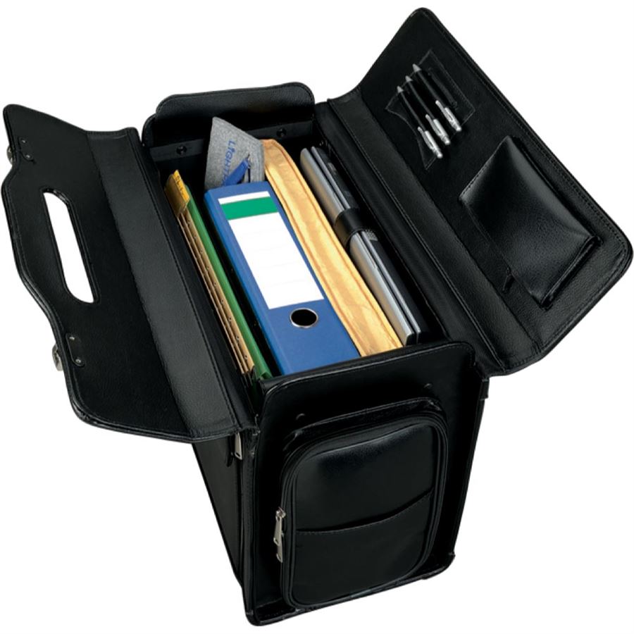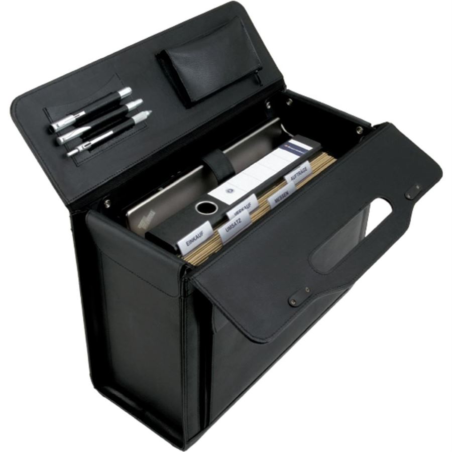 Velmi kvalitně a praktický zpracovaný kožený kufr. Vnitřní prostor je vybaven polstrovanou přihrádkou pro notebook a speciálním dokumentovým pořadačem, který je možno vyklopit i z čelní strany kufru. Dále je možné do vnitřního prostoru vložit i závěsné šanony. Horní překryt kufru je vybaven zavírací kapsou na zip a pouzdrem na tužky a pera. Čelní Kapsa je opatřena kovovým otvíráním s klíčkem a postranímy zipy, které zabezpečují rychlý a pohodlný přístup k dokumentovému pořadači. Na boku naleznete kapsu na drobnosti opatřenou kovovým zavíráním. Druhá boční kapsa je opatřena celoobvodovým otvíráním na zip a zde můžete mít od psacích potřeb přes klíče až po cestovní doklady. Kufr je vybaven dvojicí zámků s číselníkem.