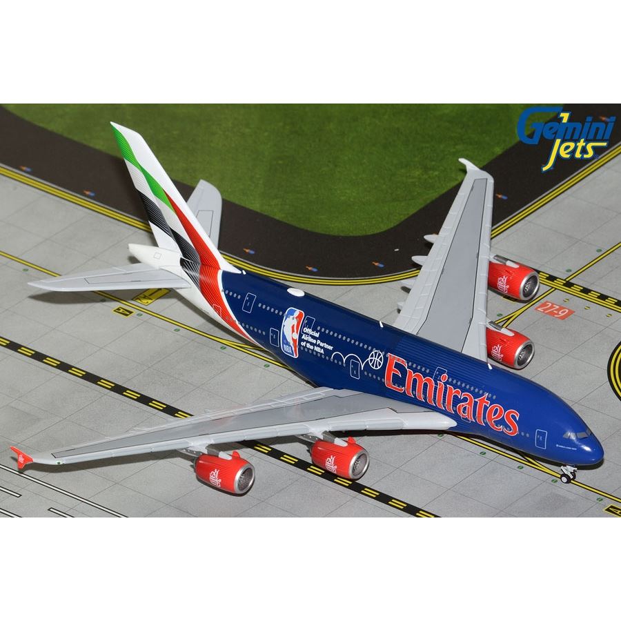 Kovový model dopravního letadla Airbus A380-841 v barvách letecké společnosti Emirates a s livery "Official Airline Partner of the NBA". Reg. A6-EOD.