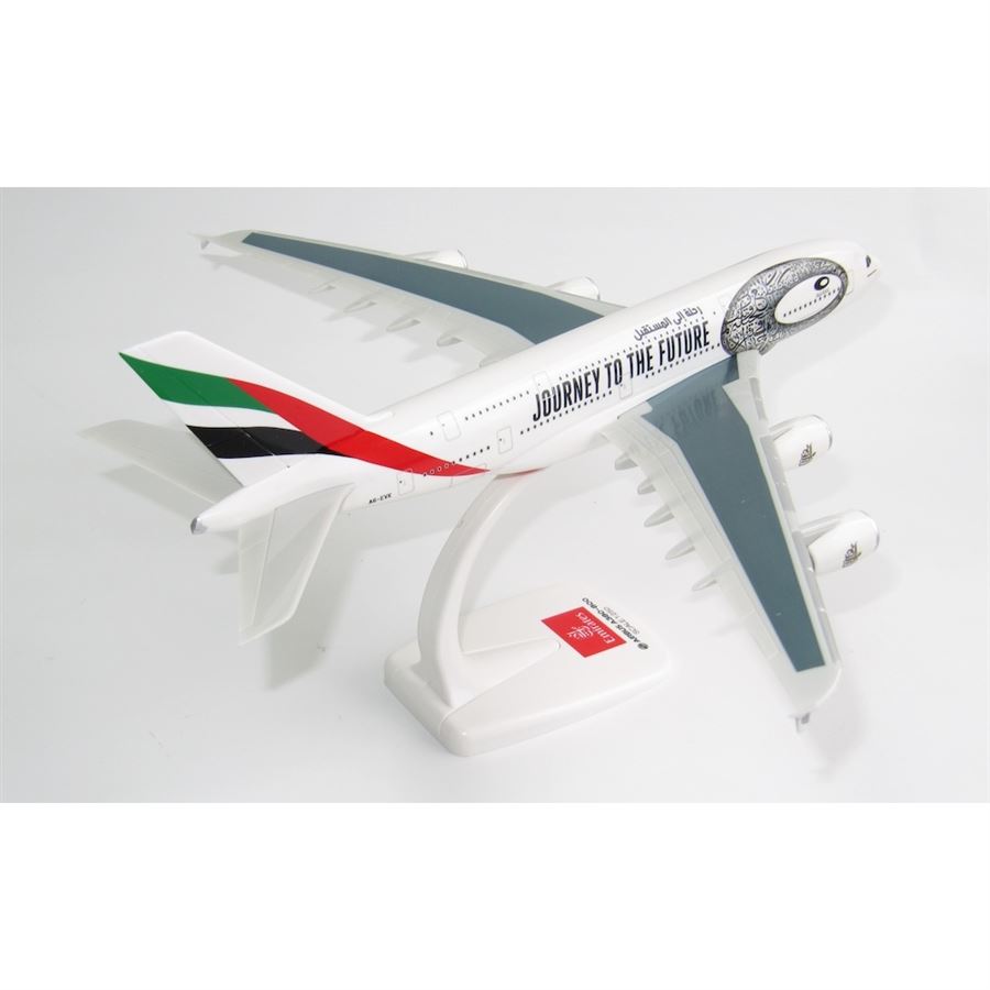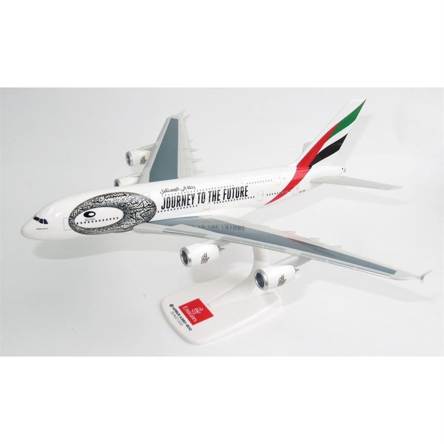 Model největšího dopravního letadla na světě Airbus A380-842 v barvách letecké společnosti Emirates s livery "Journey to the Future" a s reg. A6-EVK. Plastový model z letecké edice tzv. SnapFit modelů, který se snadno sestaví pouhým zacvaknutím (bez lepidla). Model je dodáván se stojánkem.