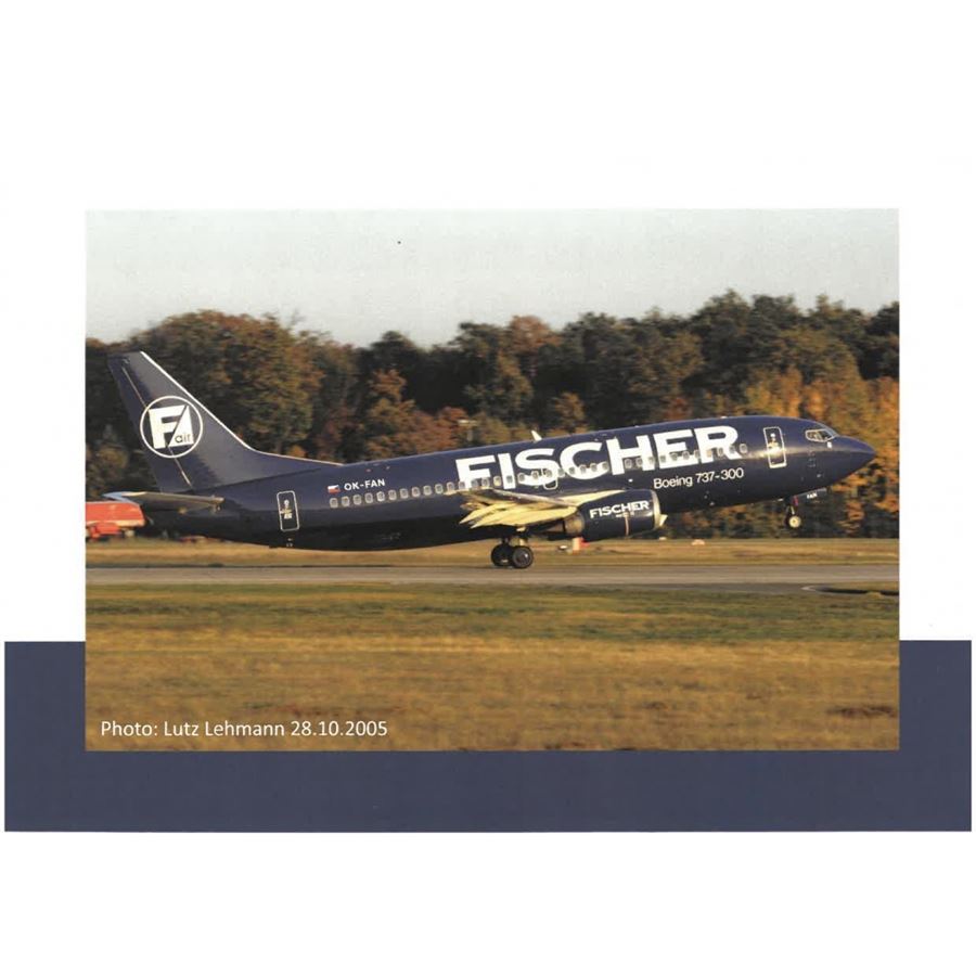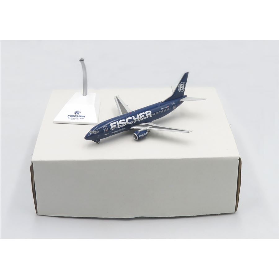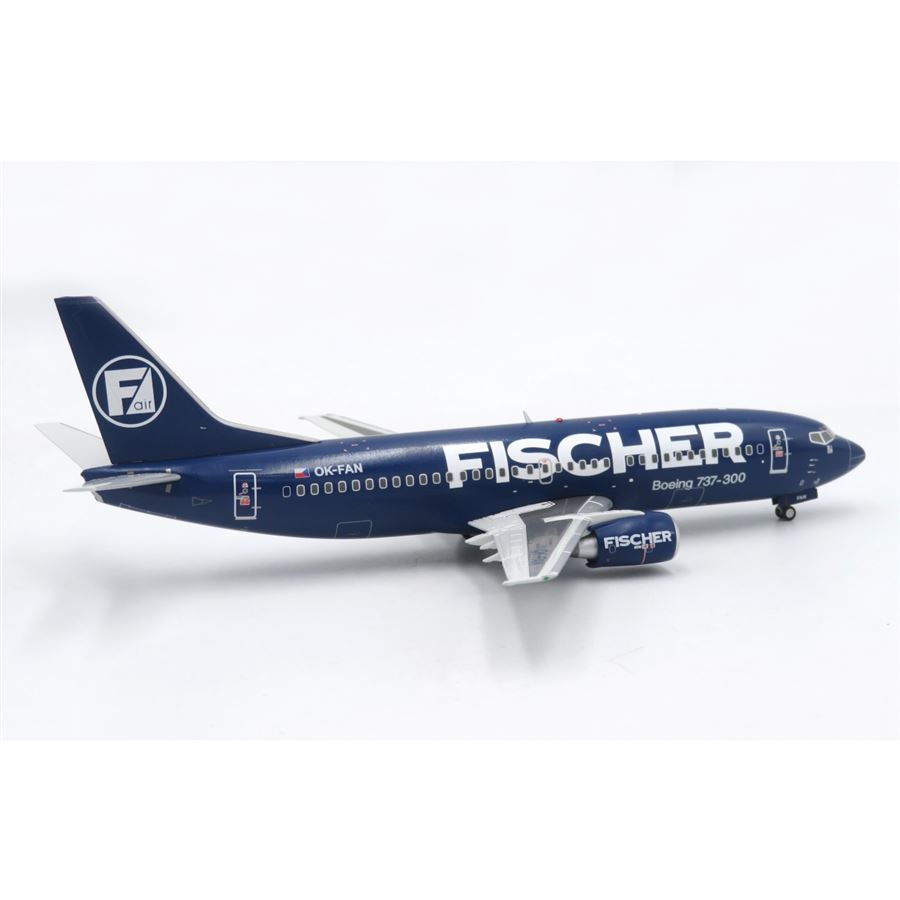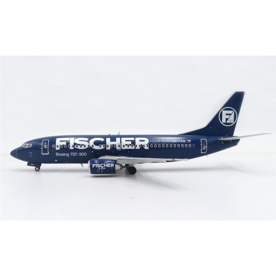 Model dopravního letadla Boeing 737-33A v barvách letecké společnosti Fischer Air a s reg. OK-FAN. Model se stojánkem.
