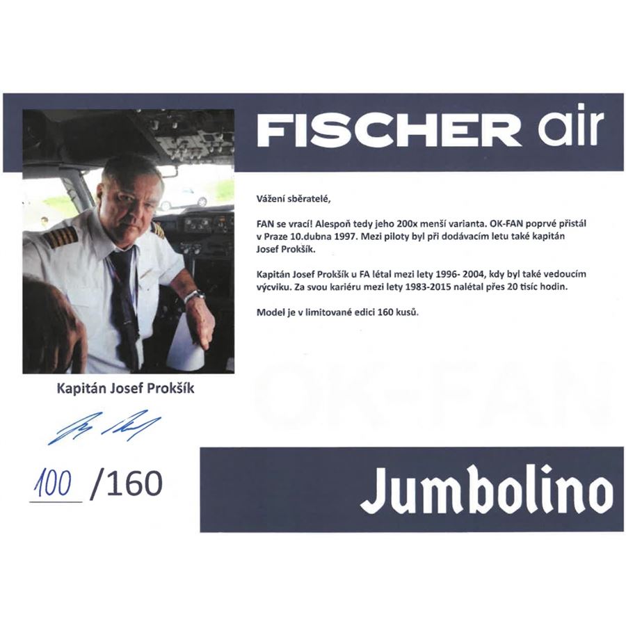Limitovaná edice 160 ks. Součástí balení je i číslovaná karta podepsaná kpt. Josefem Prokšíkem, který jako první s tímto letadlem přistál v Praze 10. dubna 1997.