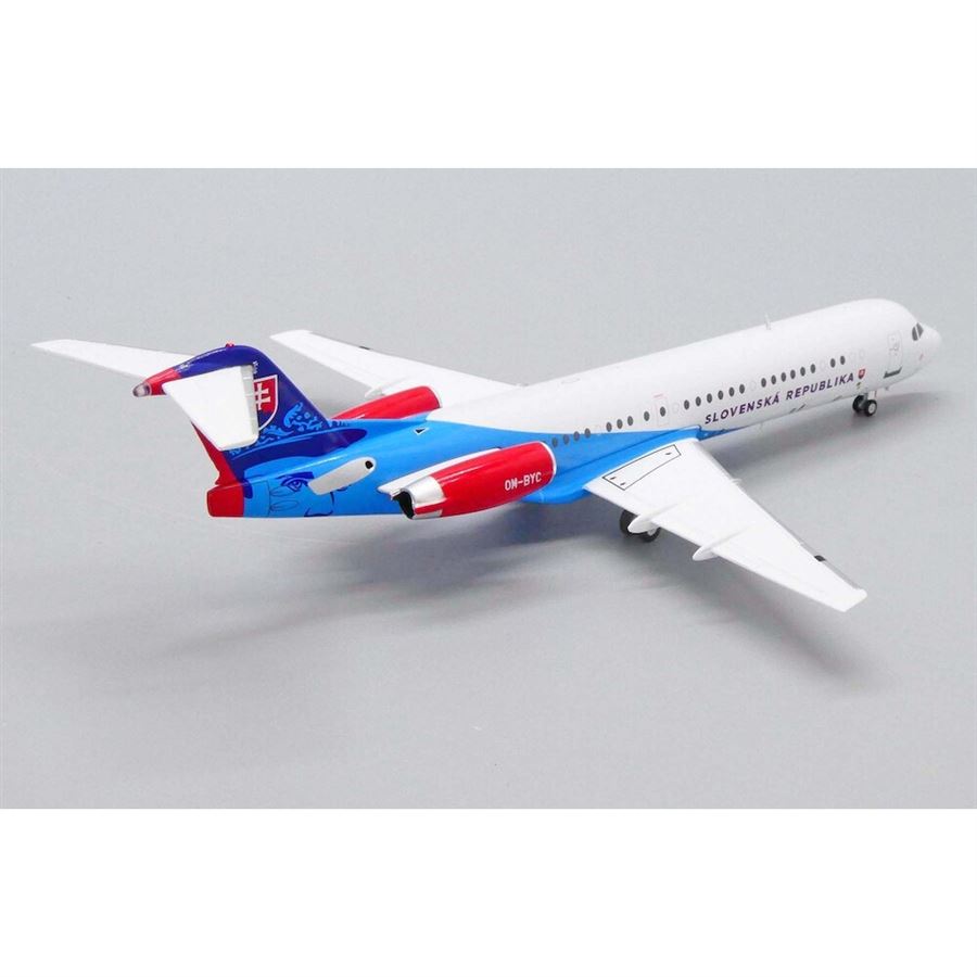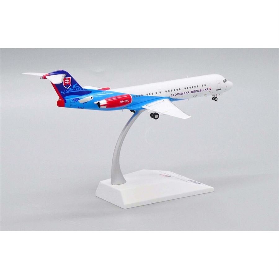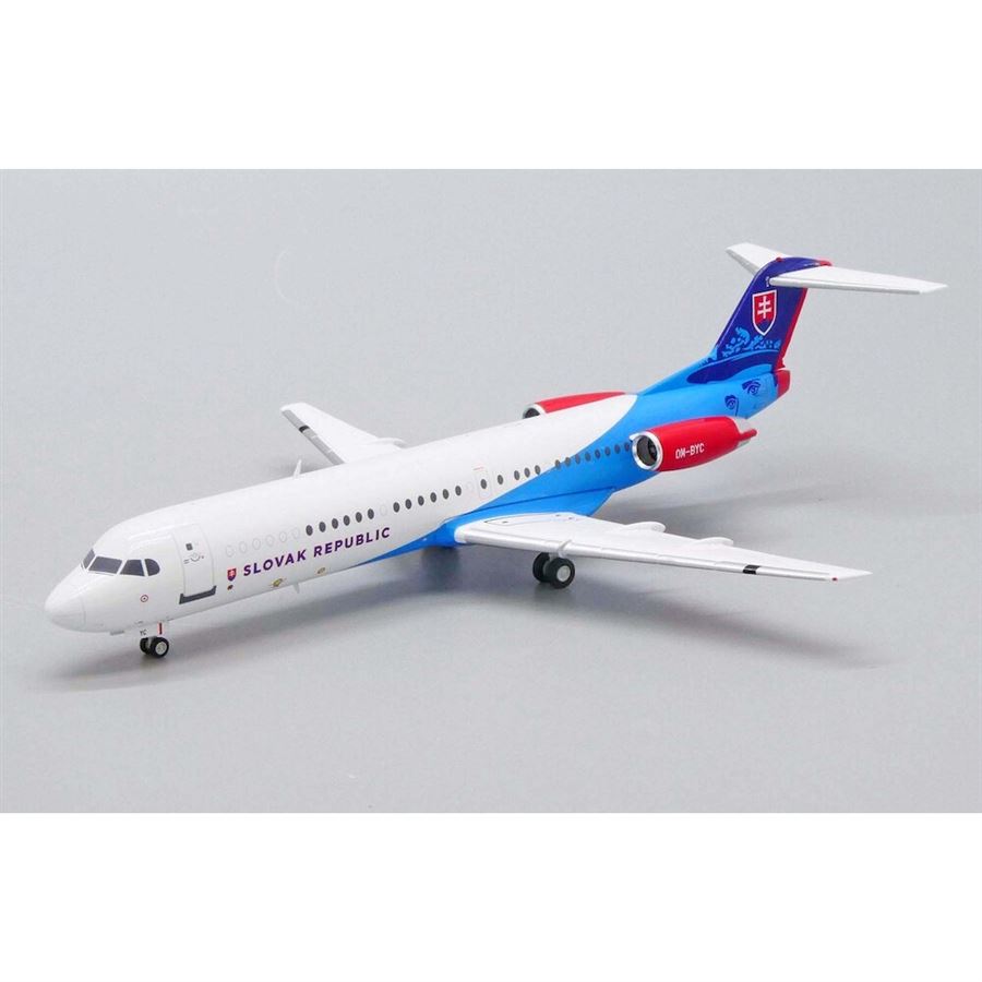 Kovový model dopravního letounu Fokker F100 ve vládních barvách Slovak Government Flight Service. Model se stojánkem a s reg. OM-BYC.