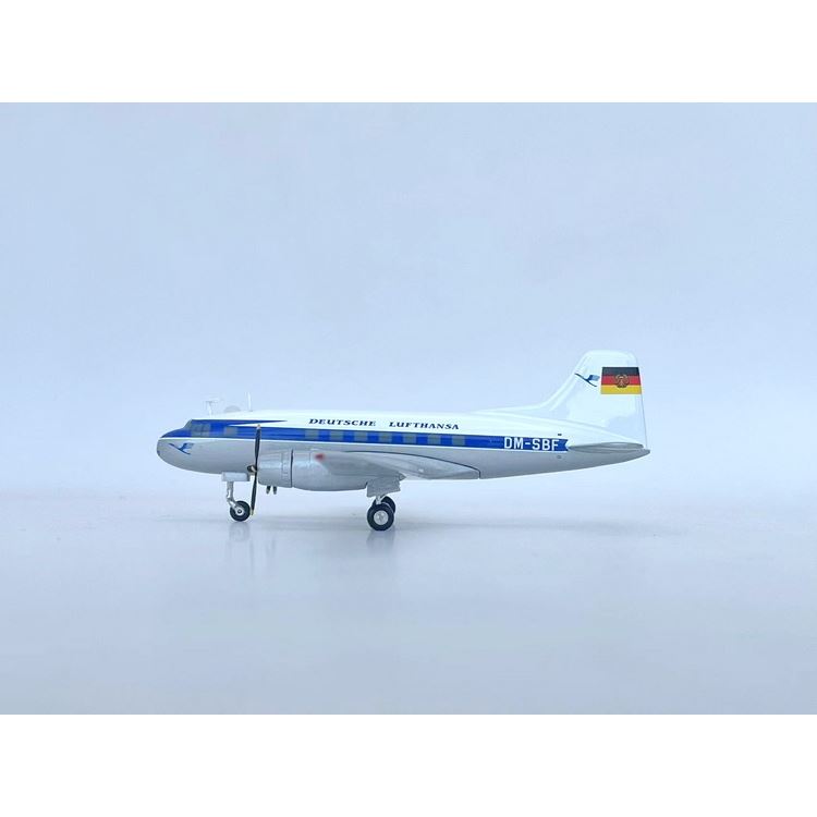 Sběratelský model dopravního letounu Iljušin Il-14 v barvách letecké společnosti Deutsche Lufthansa a s reg. DM-SBF.Měřítko: 1:200