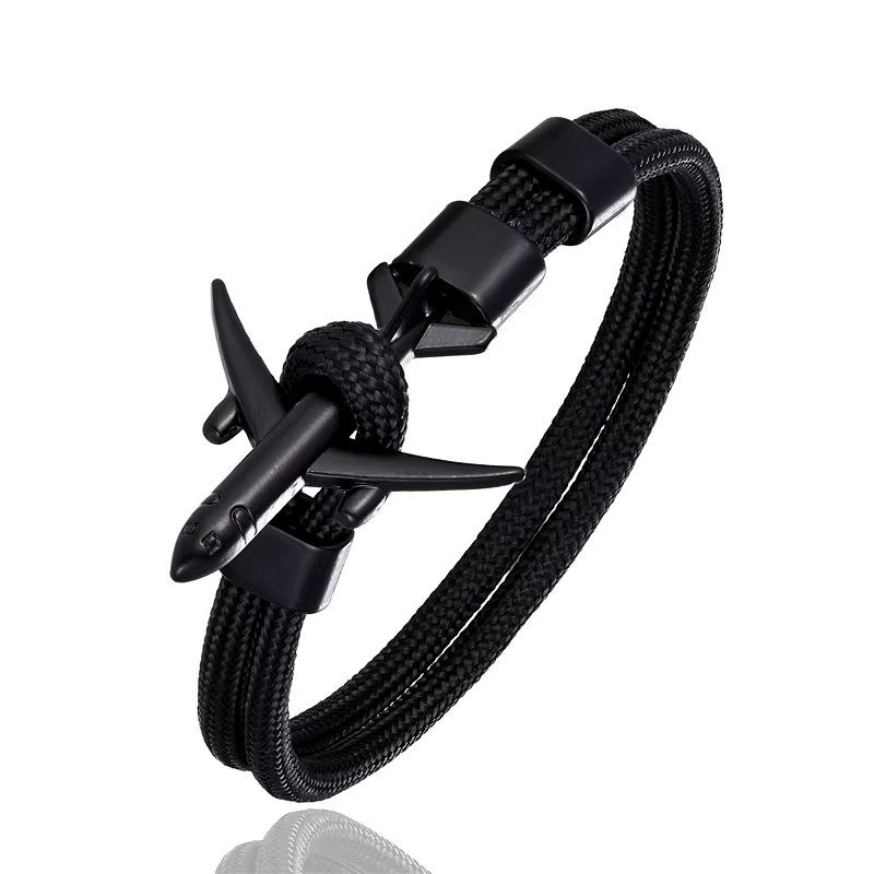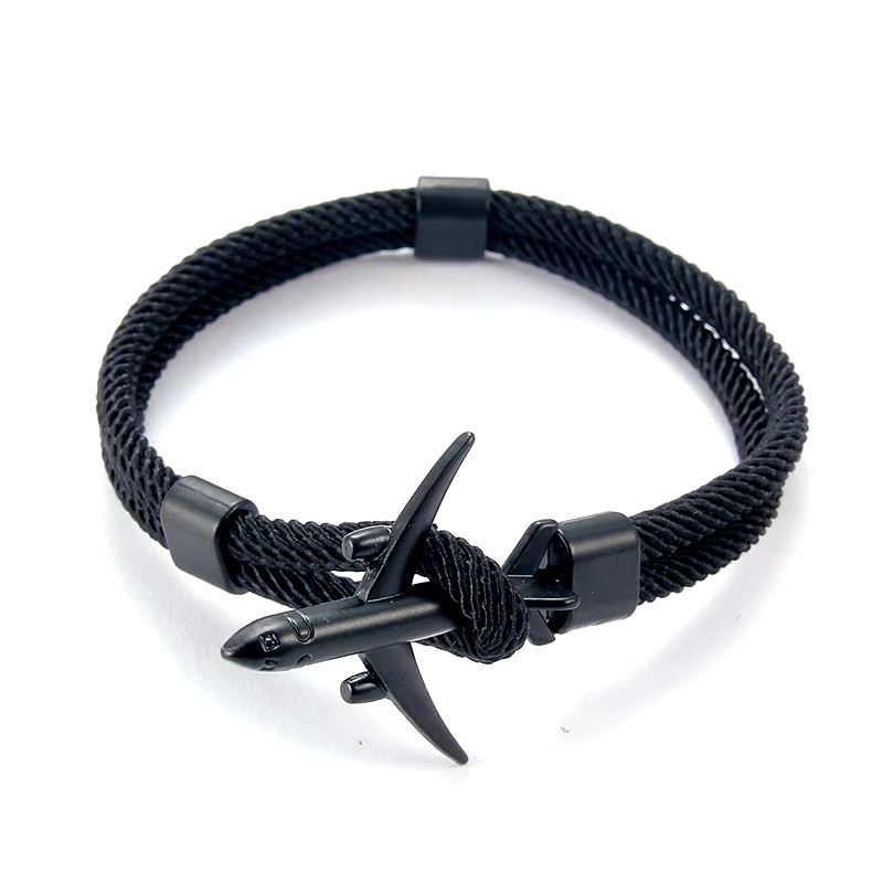 Náramek ve tvaru letadla z tmavého matného kovu. Náramek se zapíná provlečením křídel letadla poutkem náramku.