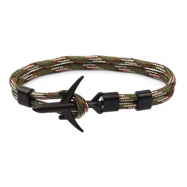Náramek ve tvaru letadla z tmavého matného kovu. Náramek se zapíná provlečením křídel letadla poutkem náramku.
