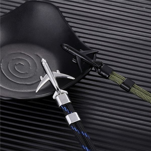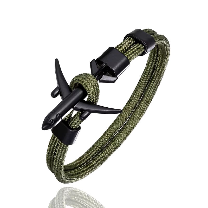 Náramek ve tvaru letadla z tmavého matného kovu. Náramek se zapíná provlečením křídel letadla poutkem náramku.