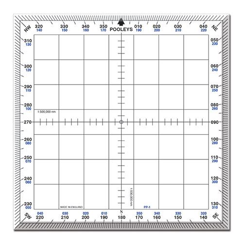 Standardní pomůcka letové školy a žáků. Stupnice 0-360 na vnější straně okraje s uvedenými vzájemnými popisy. Lokace NE, SE, SW a NW v každém rohu. Střed je vyvrtaný pro umístění a mřížky ve čtvercích 13 mm (4 nm). Dodáváno v samolepícím průhledném plastovém pouzdru.