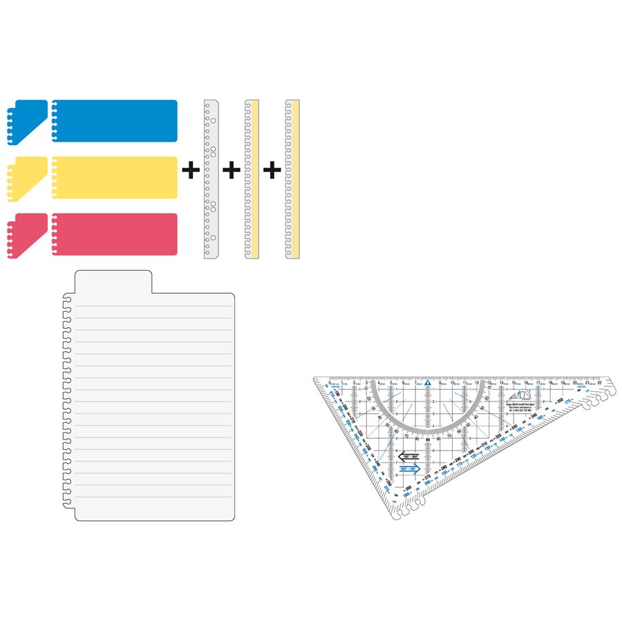Sada obsahuje všechny pomůcky nabízené k Databázi letišť: 3+3 kusy záložek do kroužkové vazby (malá + velká), 2x proužek pro zavěšení Databáze letišť do nákoleníku/šanonu, 2x proužek pro rychlé vložení do kroužkové vazby (se samolepící vrstvou), vkládací popisovatelnou stránku, navigační trojúhelník. Pomůcky jsou vyrobeny z plastu a mají speciální děrování pro jednoduché a rychlé vložení do kroužkové vazby. Díky děrování je možné pomůcky pohodlně vložit mezi vámi požadované strany a jednoduše je také vyjmout.