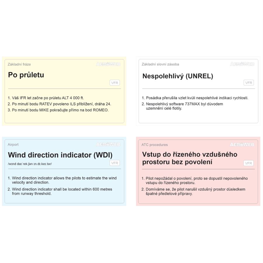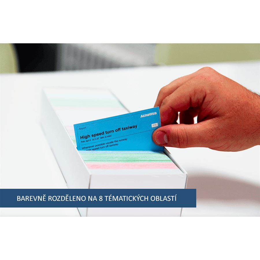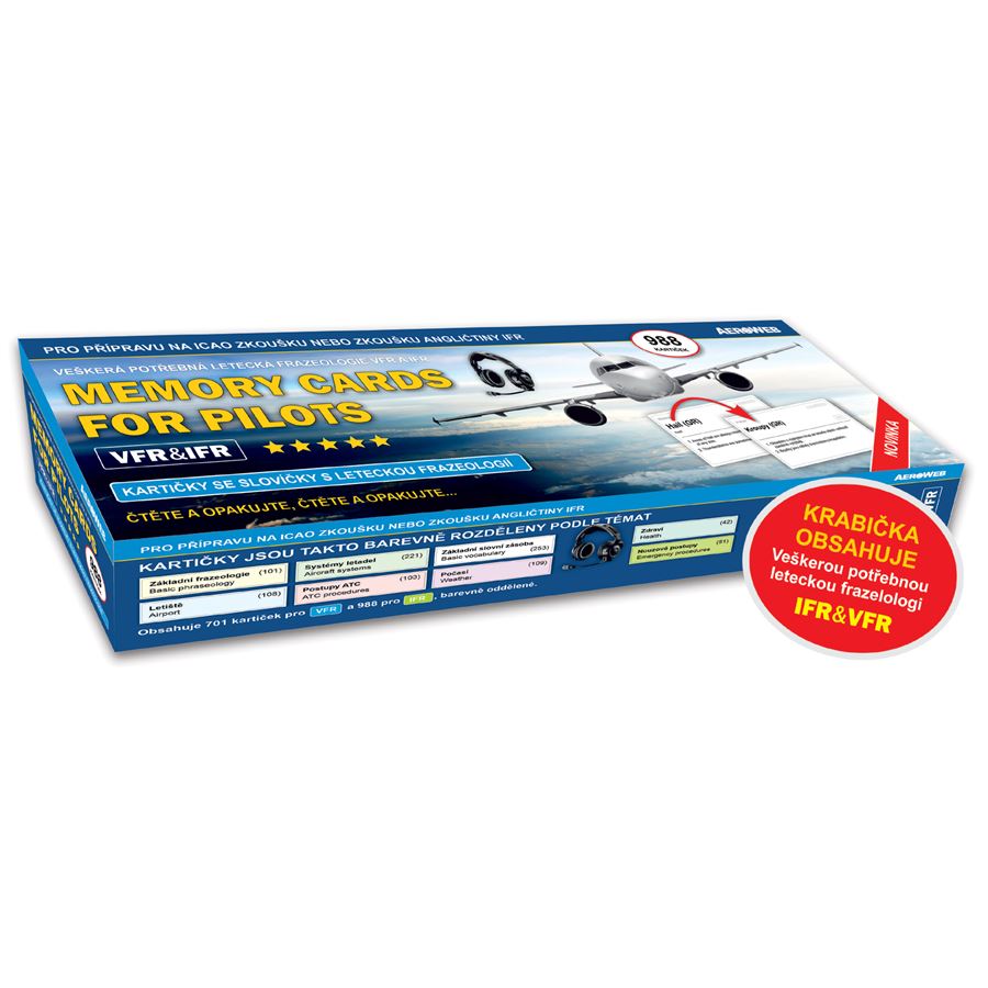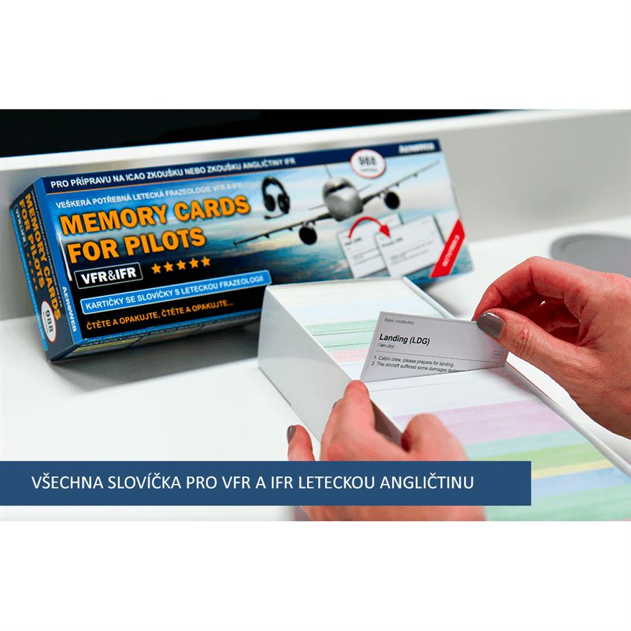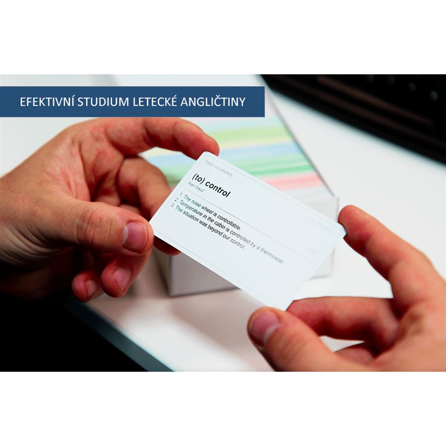 Krabička obsahuje veškerá potřebná slovíčka letecké frazeologie. Pokud se naučíte každý den 30 kartiček, zvládnete celý rozsah za měsíc.