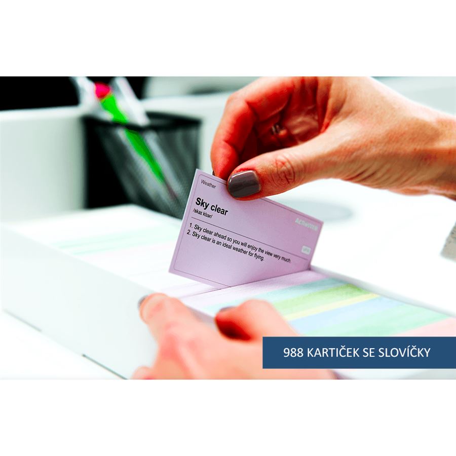 Rozsah slovíček odpovídá požadavkům na reálný provoz. Pečlivě vybraná nejpoužívanější slovíčka a rozdělená podle oblastí, barevně rozlišená a vložená do útulné krabičky.