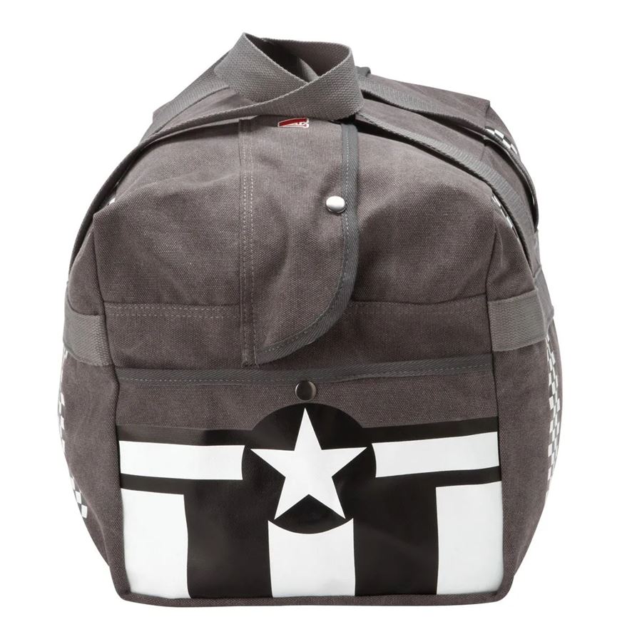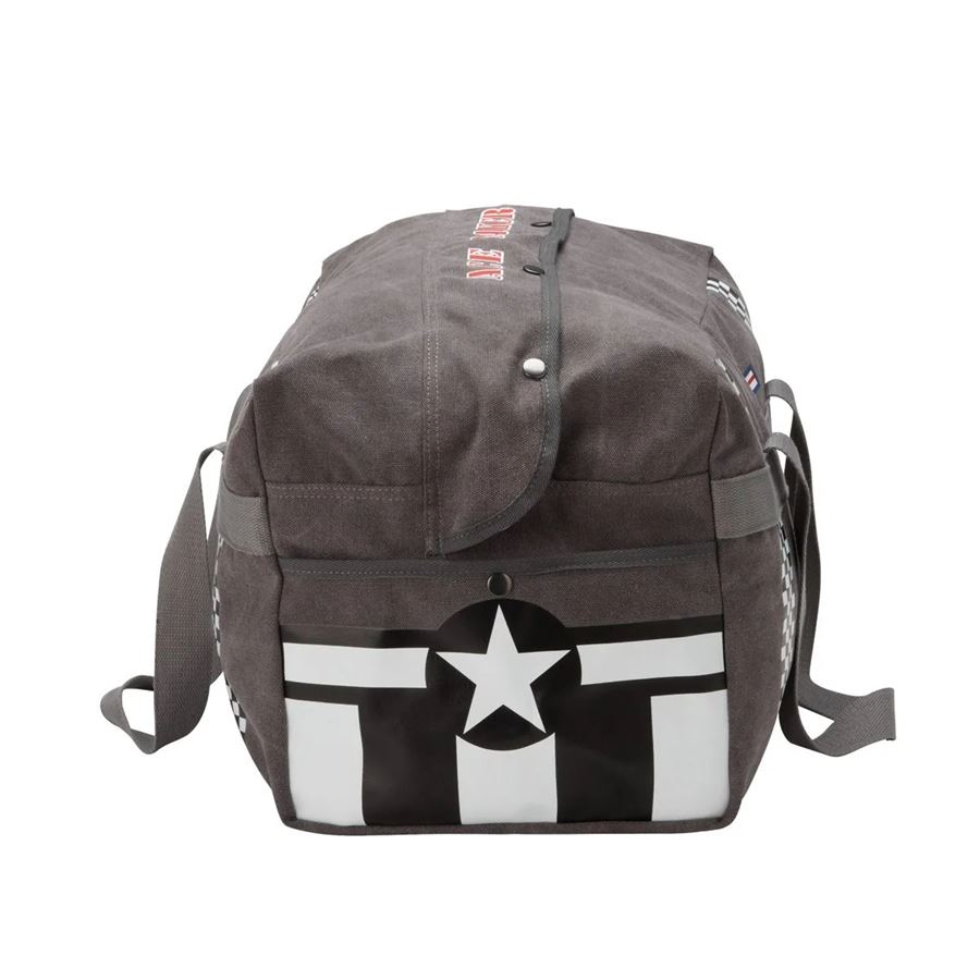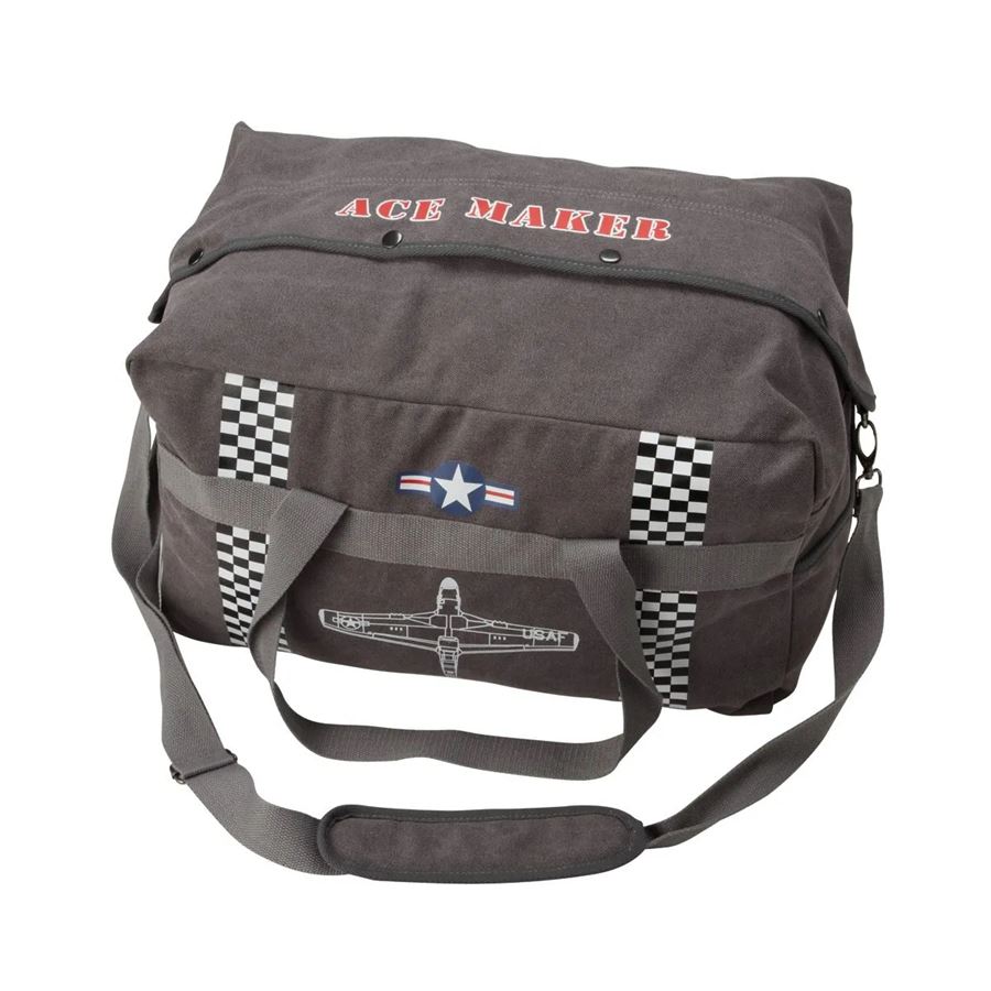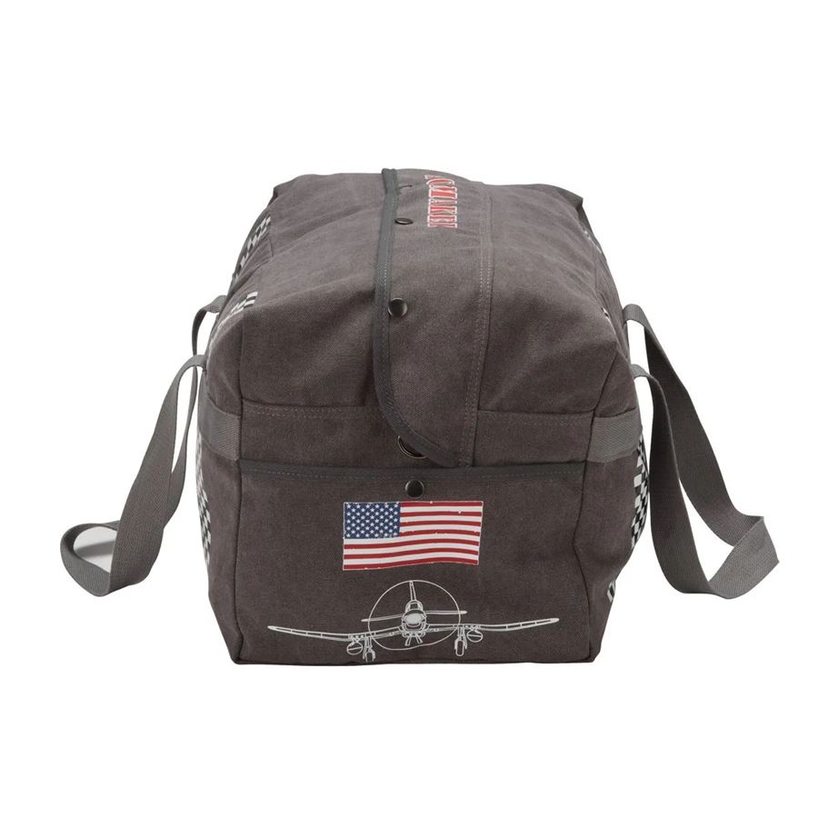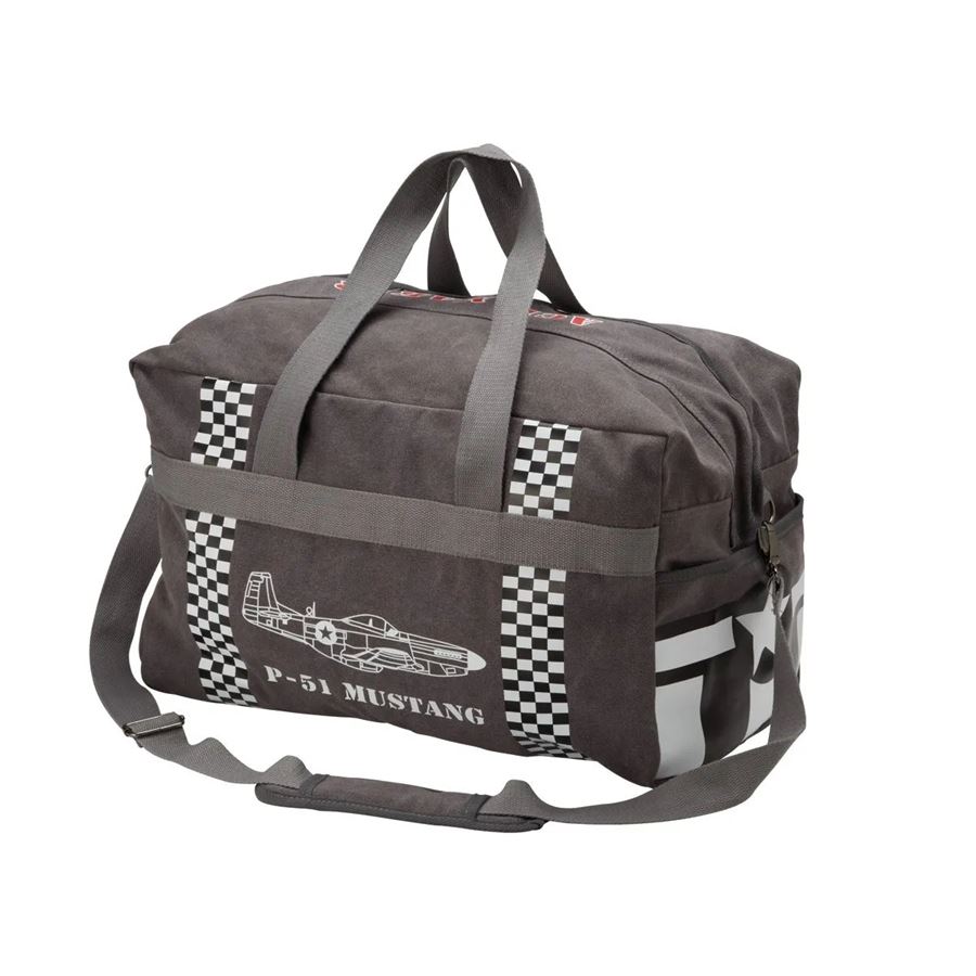 Sportovní taška P-51 Mustang byla navržena po vzoru padákových vaků z druhé světové války. Jde o víceúčelovou cestovní tašku, ideální na kratší výlet nebo jako taška do posilovny. Sítotisková grafika se objevuje na všech stranách pro větší přitažlivost. Na vrchu tašky vyšívaný nápis Ace Marker, po stranách americká vlajka, grafické obrázky letounu P-51 Mustang a dvě boční kapsy. Sportovní taška má nastavitelný ramenní popruh a odolný zip. Materiál: bavlna.