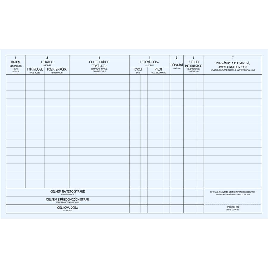 Zápisník letů pro vedení letové dokumentace dle LAA ČR. Pevná vazba ve vysoce kvalitní kožence s okovanými růžky. Zápisníky mají pevnou a trvanlivou vazbu ve vysoce kvalitní kožence (švýcarská výroba) s okovanými růžky. Jsou vytištěny na kvalitním barevném papíru, všechny texty jsou vysázeny česko-anglicky. Titulní strana je ozdobena zlatým nápisem ZÁPISNÍK LETŮ. Vzor zápisníku je schválen LAA ČR.